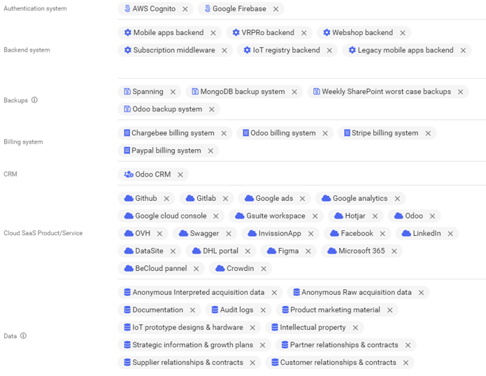 - Who are the stakeholders that might be impacted might anything happen to these assets? Examples: Government, Emergency Services, Employees, Competitors, Legislators & regulators, Data subjects (People behind the data, e.g. patients), End users (Users of our products/services), Sales prospects (potentials users of our services), Research partners, Development teams (Digital, firmware, hw), Marketing (influencers, external platform), Retailer (sales of our products), Shareholders, External auditors/accreditors, Distributors, GDPR Supervisory authority, Board of directors, Product quality & compliance (product quality), Insurers, Infrastructure critical suppliers, Strategic business suppliers